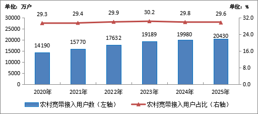 固定互联网宽带接入服务持续在农村地区加快普及,截至2025年底,全国农村宽带用户总数达2.04亿户,全年净增450.7万户。